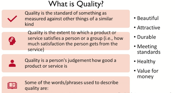 Looking on the extreme right of the diagram, we will see some of the words used to describe quality e.g. beautiful, attractive, durable, meet the standards, healthy and has value for money.